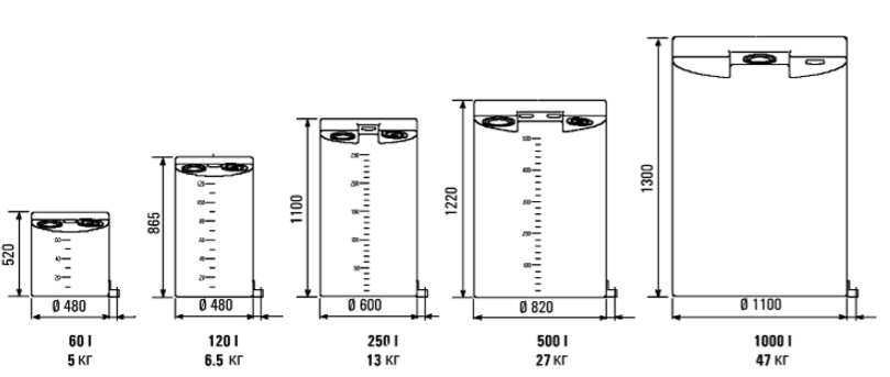 • Доступные размеры бака: 60, 120, 250, 500, 1000 л