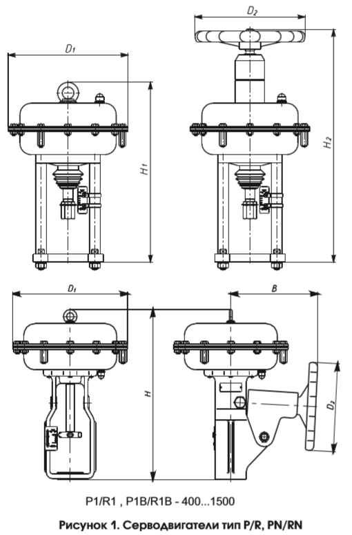 Рaзмеры и мaссы пневмaтических серводвигaтелей P1/R1 и P1B/R1B - рис. 2.