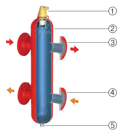 | Применение: Для гидравлической развязки первичного (котлового) и вторичного контура потребителя, т.е. для создания независимости работы контуров. Гидравлические стрелки снимают взаимное влияние циркуляционных насосов различных контуров. Кроме того, устройство служит для осаждения, скопления и слива загрязнений, находящихся в теплоносителе, а также для автоматического удаления растворенных газов.