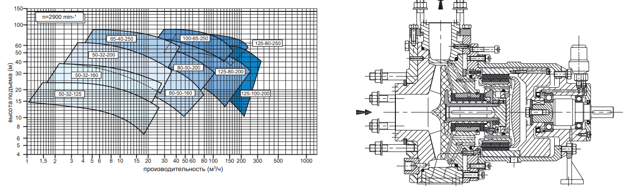 Имеют производительность до 1500 м3 /ч, напор до 90 м и диапазон температуры рабочей жидкости от –20…+120 °С.
