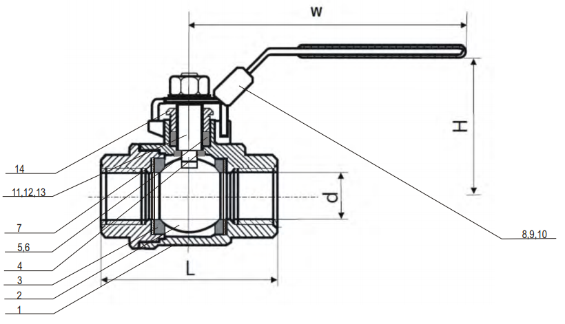 W - длина рукоятки полнопроходного шарового крана от оси поворота, мм