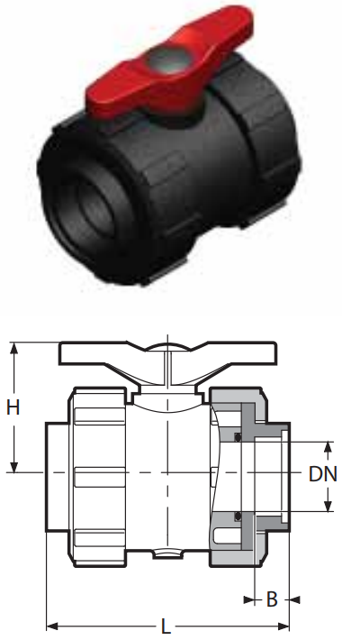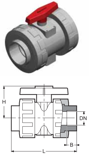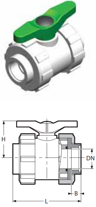 | Шаровый кран 2027, разборное соединение, муфта с внутренней трубной цилиндрической резьбой BSP, материал — PVDF