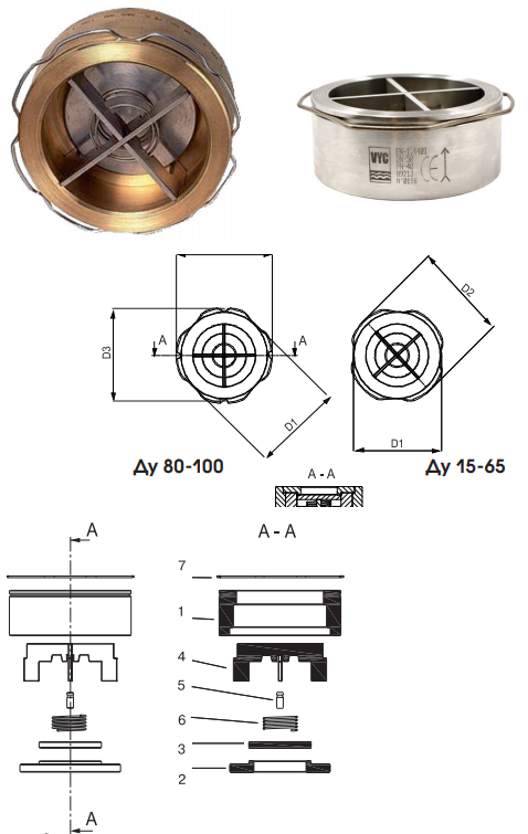 Обратный клапан межфланцевый VYC 170- VYC172, Ду15-200, Ру16/40, латунь, сталь, нерж. сталь