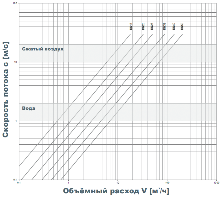 C помощью диаграммы, имея конкретное значение объёмного расхода V (м³/ч), определяется номинальный диаметр (DN). В соответствии с положениями закона DVGW (DIN 1988), скорость потока рабочей среды в бытовых системах не должна превышать 2 м/с.