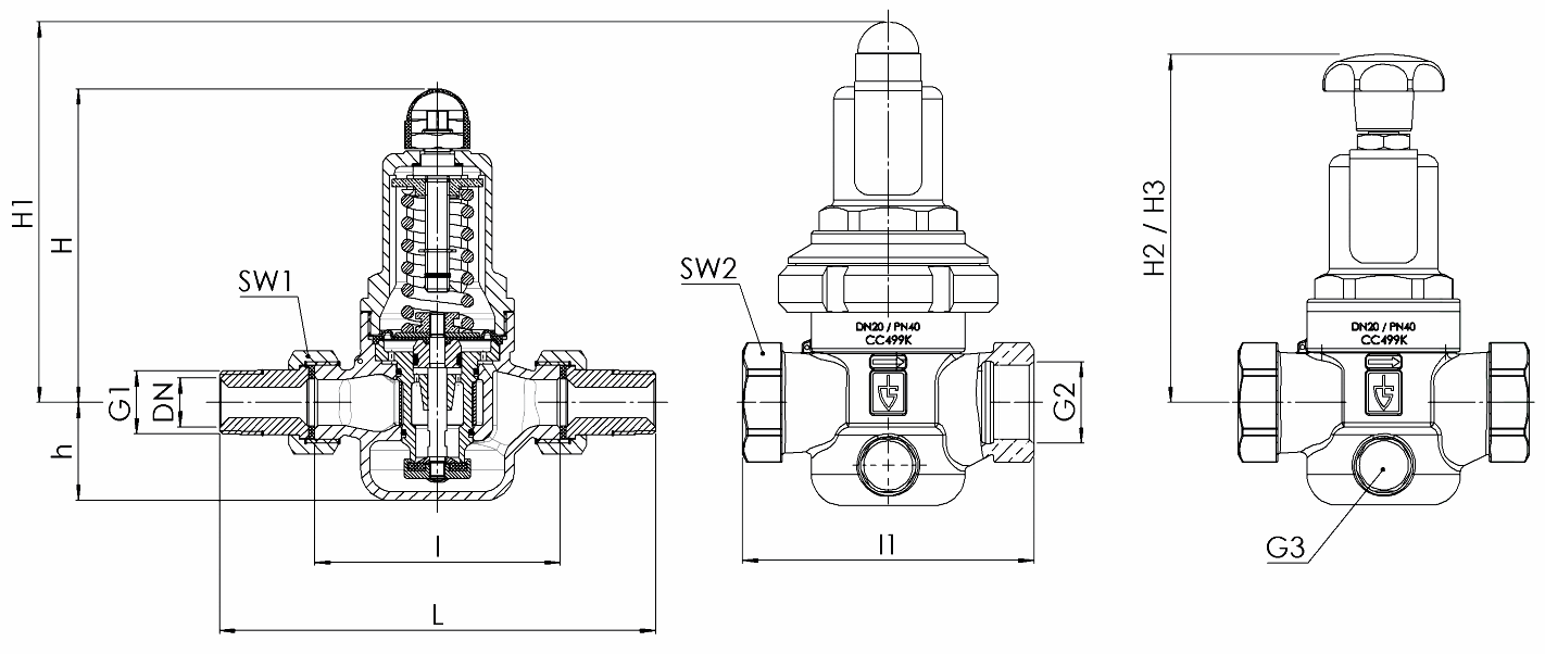 m с мембраной высококачественная мембрана из жаропрочного эластомера, с тканиевой вставкой. Настройка давления посредством бесподъемного шпинделя. Клапанная вставка с разгруженным золотником выполнена целиком из нержавеющей стали