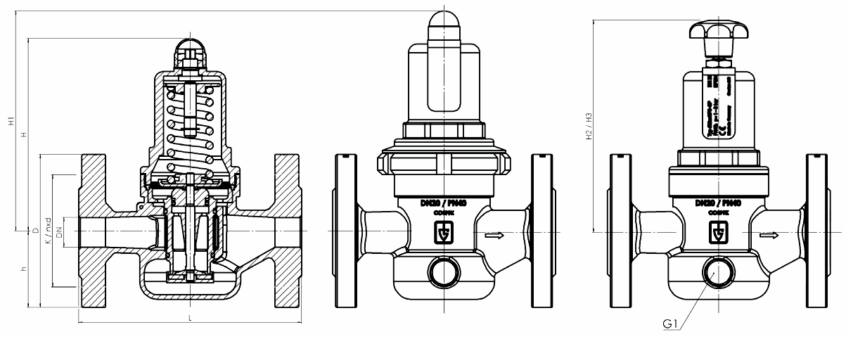 m с мембраной высококачественная мембрана из жаропрочного эластомера, с тканиевой вставкой. Настройка давления посредством бесподъемного шпинделя. Клапанная вставка с разгруженным золотником выполнена целиком из нержавеющей стали