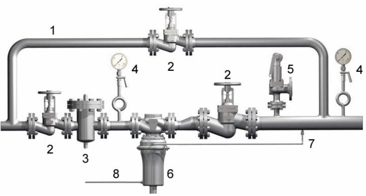 1 Обводная линия для технического обслуживания 5 Предохранительный клапан