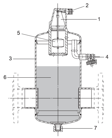 Конструкция сепаратора воздуха Flamcovent в стальном исполнении Сепараторы воздуха Flamcovent предназначены для использования в замкнутых системах отопления и охлаждения при максимальной температуре 120 °С и максимальном давлении 10 бар. | Спецификация 1. Воздушная камера Воздушная камера сепаратора воздуха Flamcovent имеет коническую форму, что обеспечивает наибольшее расстояние между уровнем воды в камере и выпускным клапаном. Благодаря этому грязь, плавающая на поверхности сепаратора воздуха Flamcovent, будет находиться на достаточном удалении от выпускного клапана, что сводит засорение рычажного механизма и выпускного клапана к минимуму. Возможно закрытие выпускного клапана сепаратора вручную.