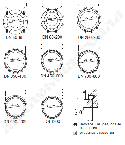 | DN, (мм) | K, (мм) | Кол-во отверстий | M | T, (мм) | ![]() | Макс. длина нескв. болта, (мм) PN 1,0 МПа* | Макс. длина нескв. болта, (мм) PN 1,6 МПа* |