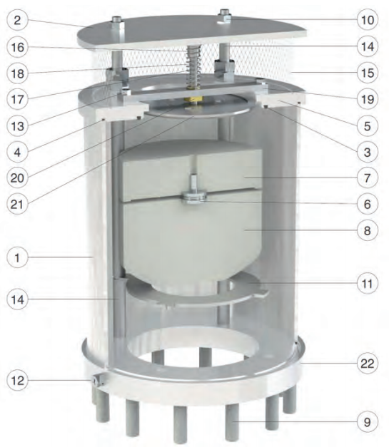 • Подвижный блок состоит из цилиндрического поплaвкa и верхнего дискa из твердого полипропиленa, соединенного друг с другом посредством системы сбросa воздухa из нерж стaли AISI316/Duplex.