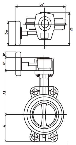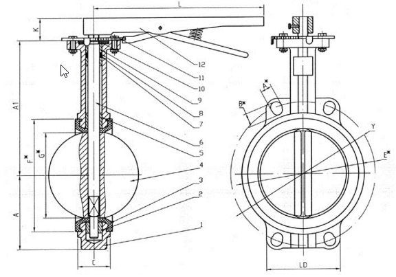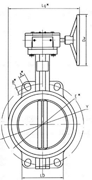 Условное графическое изображение затвора поворотного дискового на чертежах и схемах: |  Вариант 1. |  Вариант 2. | Чертеж габаритный затвора поворотного дискового чугунного межфланцевого ABRA-BUV-VF826D и ABRA-BUV-VF863D и ABRA-BUV-VF866D с рукояткой Ду32-300 (размеры в таблице ниже, габариты затвора с редуктором - еще ниже):  | |  В положении “Закрыто” | Профилированный под квадрат верх штока является существенным преимуществом в случае установки электропневмопривода | ABRA BUV-826 DN32-150 PN10/16, DN200-300 PN16 ABRA BUV-863 DN32-150 PN10/16, DN200-300 PN16 ABRA BUV-866 DN32-150 PN10/16, DN200-300 PN16 | Чертеж габаритный затвора поворотного дискового чугунного межфланцевого ABRA-BUV-VF826D и ABRA-BUV-VF863D и ABRA-BUV-VF866D с редуктором Ду32-600 (размеры в таблице ниже): |  ABRA BUV-826 DN32-150 PN10/16, DN200-300 PN16 ABRA BUV-863 DN32-150 PN10/16, DN200-300 PN16 ABRA BUV-866 DN32-150 PN10/16, DN200-300 PN16   В положении “Закрыто” |  ABRA BUV-826 DN350-600 PN16 ABRA BUV-863 DN350-600 PN16 ABRA BUV-866 DN350-600 PN16  | | Диаграмма Давление / Температура для затвора поворотного дискового ABRA-BUV-VF826Dxxx и ABRA-BUV-VF866D Ду32-600, Ру16  | Диаграмма Давление / Температура для затвора поворотного дискового ABRA-BUV-VF863Dxxx Ду32-600, Ру16 | Диаграммы определяют рабочую область дла затвора поворотного дискового ABRA-BUV-VF826Dxxx Ду 032-600, Ру16 и ABRA-BUV-VF863Dxxx Ду 032-600, Ру16 и ABRA-BUV-VF866Dxxx Ду 032-600, Ру16 в координатах Давление (в барах приборного) / Температура (° C). Габаритные размеры, рабочие давления и температуры, крутящие моменты, вес и Kv затвора поворотного дискового чугунного ABRA-BUV-VF826DxxxH(BS*) Ду32-600 Ру16 и ABRA-BUV-VF863DxxxH(BS*) Ду32-600 Ру16 и ABRA-BUV-VF866DxxxH(BS*) Ду32-600 Ру16, межфланцевого. Размеры в мм. - Покрытие поверхности (окраска) порошковое эпоксидное электростатическое с предварительным нагревом и выдержкой до полной полимеризации. | Ду / DN | 32 / 40 | 50 | 65 | 80 | 100 | 125 | 150 | 200 | 250 | 300 | 350 | 400 | 450 | 500 | 600 | (1 1/4" - 1 1/2") | (2") | (2 1/2 ") | (3") | (4") | (5") | (6") | (8") | (10") | (12") | (14") | (16") | (18") | (20") | (24") | | Ру / PN | 16 бар (1,6 МПа) | | Диапазон рабочих температур, °C | Для EPDM: (Максимальная температура 110 °C. Минимальная температура -20 °C. Рабочая температура от -15 до +95 °C Для NBR: Максимальная температура 90 °C. Минимальная температура -20 °C. Рабочая температура от -15 до +70 °C | | Код товара ABRA-BUV | VF826 или VF863 или VF866 D040 | VF826 или VF863 или VF866 D050 | VF826 или VF863 или VF866 D060 | VF826 или VF863 или VF866 D080 | VF826 или VF863 или VF866 D100 | VF826 или VF863 или VF866 D125 | VF826 или VF863 или VF866 D150 | VF826 или VF863 или VF866 D200 | VF826 или VF863 или VF866 D250 | VF826 или VF863 или VF866 D300 | VF826 или VF863 или VF866 D350 BS* | VF826 или VF863 или VF866 D400 BS* | VF826 или VF863 или VF866 D450 BS* | VF826 или VF863 или VF866 D500 BS* | VF826 или VF863 или VF866 D600 BS* | | С - строительная длина Строительная длина EN558-1 GR (серия) 20 = ISO 5752 "short", мм | 33 | 43 | 46 | 46 | 52 | 56 | 56 | 61 | 68 | 78 | 78 | 102 | 114 | 127 | 154 | | Y-межосевое расстояние присоединительных отверстий (фланцев), мм | 100/110 | 125 | 145 | 160 | 180 | 210 | 240 | 295 | 355 | 410 | 470 | 525 | 585 | 650 | 770 | | A1 - высота от оси трубы до верхнего фланца, мм | 117 | 133 | 143 | 154 | 166 | 181 | 201 | 231 | 275 | 298 | 355 | 390 | 435 | 440 | 516 | | A , мм | 54 | 70 | 79 | 85 | 106 | 107 | 129 | 175 | 208 | 239 | 280 | 329 | 359 | 377 | 436 | | L - длина рукоятки от оси затвора, мм | 267 | 360 | 499 | 499 | не поставляется с рукояткой | | K - высота рукоятки, мм | 28 | 38 | 40 | 40 | не поставляется с рукояткой | | B1 - квадрат штока , мм | 11x11 | 11x11 | 11x11 | 11x11 | 14x14 | 17x17 | 17x17 | 17x17 | 22x22 | 27x27 | - | | B1 - диаметр штока, мм | - | 31,6 | 37,95 | 42,86 | 45,72 | 53,96 | | B2 - шпонка, мм | - | 10x8 | 12x8 | 16x10 | | Ø G* , мм | 38,1 | 46,7 | 59,4 | 75,3 | 98,2 | 117,1 | 147,9 | 195,2 | 242,7 | 292,4 | 325,6 | 380,3 | 429,3 | 481 | 580,4 | | Ø E* , мм | 80 | 97 | 111 | 129 | 153 | 183 | 208 | 266 | 317 | 374 | 429 | 480 | 530 | 582 | 662 | | Ø F* , мм | 70 | 84 | 96 | 115 | 140 | 168 | 195 | 249 | 301 | 356 | 415 | 460 | 510 | 560 | 660 | | Ø H* , мм | 48 | 66 | 80 | 90 | 114 | 137 | 160 | 207 | 260 | 308 | 348 | 410 | 458 | 510 | 614 | | LD , мм | 107 | 128 | 142 | 145 | 113 | 126 | 136 | 161 | 145 | 167 | 186 | 168 | 1