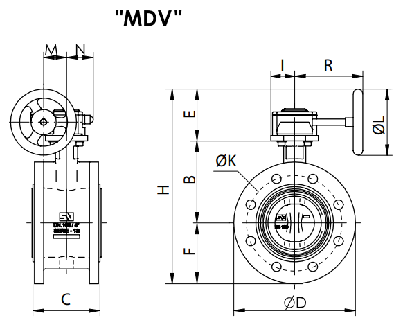Затвор дисковый поворотный с редуктором АДЛ ГРАНВЭЛ, Ду40-1200, Ру10/16. Размеры, (мм) DN тип редуктора H B F E D C I R L M N K(PN16) Масса,кг 40 X-21 273 110 75 88 150 106 42 128 125 48,65 43,5 110 8,5 50 X-21 290,5 120 82 88 165 108 42 128 125 48,65 43,5 125 9,6 65 X-21 315,5 135 92 88 185 112 42 128 125 48,65 43,5 145 10,7 80 X-21 329 141 100 88 200 114 42 128 125 48,65 43,5 160 11,9 100 X...Подробнее